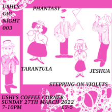 UHN003: PHANTASY ~ bizarre, queer noise-wave https://crushzonerecordings.bandcamp.com/album/czr-003-demonstration-from-the-luxury-chamber TARANTULA ~ disjointed no-wave like a scrambled body https://itsticks.github.io/tarantula/ JESHUA ~ airy & lush bedroom pop https://songsofjeshua.bandcamp.com/album/unreliable-narrator STEPPING ON VIOLETS ~ haunting goth pop meets cold synthwave https://stepping-on-violets.bandcamp.com/album/sort-of-sad