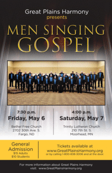 Spend the afternoon with Great Plains Harmony and it's quartets as they perform some of your favorite Gospel songs from when you were a child to newer contemporary Gospel tunes.