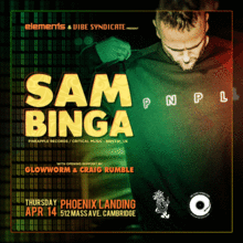 Sam Binga makes an appearance to shake the bassbins with his legendary sounds. From the intensity of Jungle to the bump n flex of Garage, the Afro-Caribbean influences of UK Funky, the percussive energy of Grime and Footwork, and a nod to Southern Rap, Binga's channelling of worldwide influences has resulted in some of underground dance music's most innovative music of recent years! Opening set by Glowworm (4ORCE) and Craig Rumble (Vibe Syndicate). Tix $10 Advance/$12 at the door.