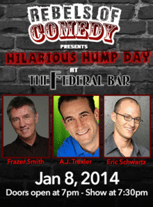 Rebels of Comedy presents Hilarious Hump Days at the Federal Bar in North Hollywood. Come out and see a night of live comedy, featuring an awesome lineup of professional features and headliner comedians. Headliners for this show : AJ Trexler, and Eric Schwartz. Hosted by Frazer Smith.