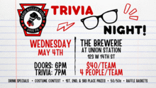 Join The Eerie Roller Girls for a night of trivia at The Brewerie at Union Station! We'll have raffle baskets, 50/50s, a Star Wars costume contest, and a special blend of Star Wars and general trivia questions! Doors open at 6PM and trivia starts at 7PM. Teams are $40, 4 people per team. Tickets available here! Your $40 ticket buys you a table with 4 seats. Gather your friends and get your Star Wars (or other!) costume ready for a chance to win fabulous prizes! All proceeds made from this event go toward funding new jerseys for the skaters!