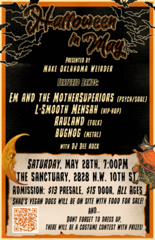 Make Oklahoma Weirder presents the counter-culture answer to Christmas in July: Halloween in May. On Saturday, May 28th, we bring a four-act live music lineup to The Sanctuary, a gothic DIY space in Oklahoma City. We'll have a costume contest and a vegan hot dog cart. This is an all ages event. $13 pre-order / $15 day of show. Order early for bad luck!
