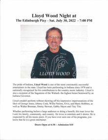 The pride of Indiana, Lloyd Wood is one of the most consistently successful entertainers in the state. Lloyd has been performing in Indiana since 1978 and is nationally recognized for his contributions to the country music industry. Lloyd is also a recipient of the Sagamore of the Wabash: the highest honor bestowed by an Indiana Governor.