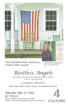TICKETS AVAILABLE AT THE DOOR! MASKS REQUIRED. City Cantabile Choir will be singing songs from the Southern Harmony tradition of American Folk Songs, including favorites such as Shenandoah, Come Away to the Skies, Glory Bound and others including Sacred Harp and Camp meeting songs. We will collaborate with Connie on her piece Restless Angels. CONNIE DOVER is an American treasure who has rediscovered the musical synergy that existed between the British Isles and the American West. She is a 2017 inductee into the Missouri Music Hall of Fame, 2007 Emmy Award winner for Musical Composition and Arrangement, and winner of the Speakeasy prize in Poetry for her book Winter Count. Connie has recorded 6 albums with a broad repertoire ranging from Celtic ballads to the American West, and is well known for Celtic Voices. Her latest recording Restless Angels of 14 original songs, is rooted in American old-time music, telling stories of passion and regret, yearning and hope, and a deep love of the land.
