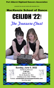 Join the MacKenzie School of Dance for our 2022 Ceilidh, The Treasure Chest! In addition to highland dancing, there will be ballet, modern and Celtic choreography. Come out and support our little dance school!