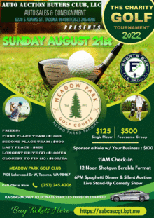 It's time to get together for a good cause! On Sunday August 21st, Auto Auction Buyers Club Auto Sales will be sponsoring our Inaugural Charity Golf Tournament at Meadow Park Golf Course at 11am. ---- PLAYERS/TEAMS There is room for 10 Four Person teams, this will be a best ball style shotgun start scramble style tourney. You must use at least one drive, approach, and putt from each player. Team entry fees are $500 per team ($125 per player); with an early bird discount of $100 off if registered before June 1st. This includes your Tee Time, a Cart, a post game meal with awards ceremony and prizes, as well as the opportunity to raise money for a great cause! ---- DONATIONS Are you interested in helping out, but aren't able to/don't want to play in the event? We will gladly accept your donations of any size (including vehilces); to help raise funds for this great cause. We've given away a car already, and want to help as many people in need as possible! ---- SPONORS: There are 18 hole sponsorships available, if you purchase one it will give your business the opportunity to setup your own 10x10 canopy at the Green of your choice of the 18 holes (first come first served); you will have the opportunity to give away promotional items, increase brand recognition, and enjoy a day out in the sun! Hole Sponsorships are $300, with an early Bird Special for those who signup by June 1st! The earlier you sign up, the earlier you're brand will able to be included in marketing materials. Your brand and logo will also be featured prominently at the awards ceremony; as well as in our fliers, media, and posters. All proceeds will go towards helping someone in need, get a vehicle. If we raise enough money, we may be able to give a few vehicles away! ---- PRIZES: What's a tournament without prizes??? There will be several prizes available: 1st place team: $1000 2nd place team : $500 Last Place Team : $250 Longest Drive : $100 Closest To The Pin : $100 All prizes are to be awarded at a post tournament Spaghetti Feed. Team photos will be circulated to the media, with brand recognition if wanted. ---- Here's how to signup: Contact Chris Aldridge admin@aabcas.com 253.245.4206 Stop By The Lot: 6239 S Adams St 98409