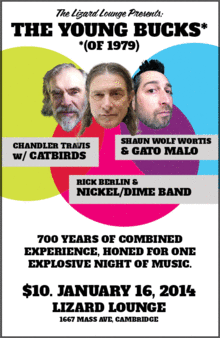 Thursday 1/16 - YOUNG BUCKS (OF 1979)! CATBIRDS SHAUN WOLF WORTIS AND GATO MALO RICK BERLIN AND THE NICKEL AND DIME BAND $10 advance / $10 at the door 8:30 doors / 9:30 show www.chandlertravis.com www.rickberlin.com www.gatomalo.com