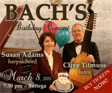 Lutenist Clive Titmuss and harpsichordist Susan Adams explore these ideas in the music they have chosen to play in this concert celebrating his 329th birthday. Just how did his signature style come about, and for whom did he craft his unique and personal early works? By choosing particular pieces and playing them in the lucid baroque style for which they have become famous, the musicians demonstrate the enduring importance of Bach's genius.