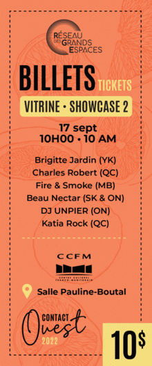 Les six artistes en vitrine 2 sont : The six artists presenting the 2nd showcase are: Brigitte Jardin (YK) Charles Robert (QC) Fire & Smoke (MB) Beau Nectar (SK & ON) DJ UNPIER (ON) Katia Rock (QC)