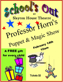 Come see Professor Horn's Puppet and Magic show at Slayton House. His comedy magic act is wonderfully clever and gives several children a chance to participate. Watch for the rabbit that keeps appearing and vanishing! It will have the audience howling with laughter. Following the magic show is a fast paced slapstick comedy puppet show. Each child will receive a gift and an opportunity to pet "MONTY" the puppet rabbit!