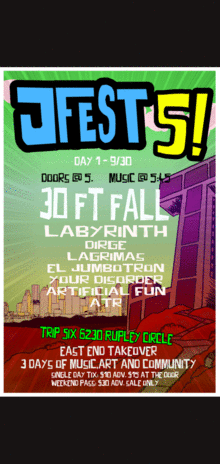 ATR 5:45 - 6:10 Artificial Fun 6:30 - 6:55 Your Disorder 6:45 - 7:10 El Jumbotron 7:30 - 7:55 Dirge 8:15 - 8:45 Lagrimas 9:10 - 9:35 30 Foot Fall 10:15 -11:00 Labyrinth 11:30- 12:00