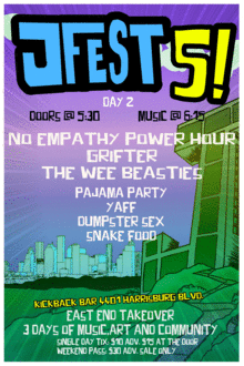 Snake Food 6:15 - 6:45 Dumpster Sex 7:00 - 7:30 Yaff 7:45 - 8:15 Pajama Party 8:30 - 9:00 The Wee- Beasties 9:15 - 9:45 Grifter 10:00 - 10:30 10:50 - 12:00 No Empathy Power Hour