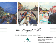 Join friends and neighbors on North Elm Street in Avoca, Iowa. A chef-hosted five-course meal will be presented sourced from our Avoca Main Street Farmers Market vendors and other nearby producers. Chef James Edward Calkins of Milk & Honey Restaurant is designing and executing the menu. Paul Hart, local acoustic musician, will provide entertainment. Happy Hour will begin at the Avoca Legion Hall at 112 N Elm Street beginning at 4 p.m. Weather permitting, we will move to dine outside at our Longest Table from 5-7 p.m.