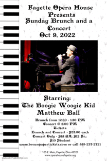 Then join us in the auditorium at 2:00 PM as we welcome The Boogie Woogie Kid, pianist Matthew Ball, from Detroit, MI. This concert will be sure to burn off some of those calories with toe tapping, hand clapping boogie woogie music. Tickets cost: