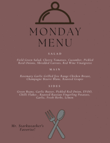 Monday 10/24: Field Green Salad, Cherry Tomatoes, Cucumber, Pickled Red Onions, Shredded Carrots, Red Wine Vinaigrette | Garlic Dinner Rolls tossed in Olive Oil | Rosemary Garlic Grilled Free Range Chicken Breast, Champagne Beurre Blanc, Roasted Grapes | Green Beans, Garlic Butter, Pickled Red Onion,