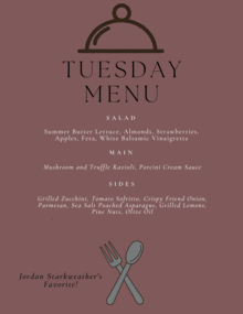 Tuesday 10/25: Summer Butter Lettuce, Almonds, Strawberries, Apples, Feta, White Balsamic Vinaigrette | Garlic Dinner Rolls tossed in Olive Oil Mushroom and Truffle Ravioli, Porcini Cream Sauce | Grilled Zucchini, Tomato Sofrito, Crispy Fried Onion, Parmesan | Sea Salt Poached Asparagus, Grilled Lemons,
