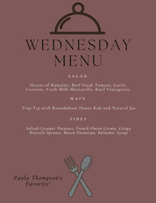 Wednesday 10/26: Hearts of Romaine, Beef Steak Tomato, Garlic Crostini, Fresh Milk Mozzarella, Basil Vinaigrette | Sweet Molasses Brown Bread Rolls | Tri-Tip with Roundabout House Rub and Natural Jus | Salted Creamer Potatoes, French Onion Crema | Crispy Brussels Sprouts, Bacon, Parmesan, Balsamic Syrup