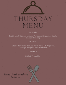 Thursday 10/27: Traditional Caesar, Lemon, Parmesan Reggiano, Garlic Caesar Dressing | Garlic Bread | Cheese Tortellini, Tomato Basil, Pesto | Rigatoni, Sausage Bolognese. Parmesan | Grilled Vegetables