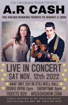 CMA Entertainment invites you to join A.R CASH: The Award-Winning Tribute to Johnny & June live in concert on Saturday, Nov. 12, 2022 at ANAF 283's Stillwell Hall located at 3584 Portage Ave, Winnipeg, MB. Doors open at 7 PM, Show time 8 PM. Tickets are available for $20 online plus fees or at the venue. For more information please visit https://arcashshow.com