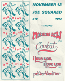 Morning Dew visits Baltimore, with local friends Powerwasher and Combat! Come enjoy dinner and drinks in the dining room before the show, and see some live music Downsquares!