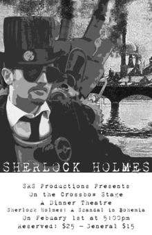 SRS Productions presents an exciting evening of Dinner Theatre. Enjoy an appetizer combination of delicious food and scenes before feasting on the main course of Bangers, Ale and one of Sir Arthur Conan Doyle's best stories adapted for the stage. Set in a Steampunk-infused, Victorian England, Sherlock Holmes: A Scandal in Bohemia places the future of European history in the hands of the mastermind Sherlock Holmes and his trusted companion, Dr. John Watson. With the future of European history on their shoulders, Holmes and Watson must try to outsmart Irene Adler, but will their plan to retrieve the photograph be thwarted by Adler's keen intellect?
