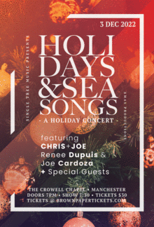 Join Chris Langathianos, Joe Wilkins, Renee Dupuis, Joe Cardoza, & special guests for a holiday season kickoff concert at Manchester's spectacular Crowell Chapel on Saturday, December 3rd at 7:30pm.