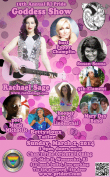 The 15th Annual RI Pride Goddess Show will be Sunday, March 2nd, 2014 and is hosted by the hilarious Poppy Champlin and features local artists including The Mary Day Band, poet Marie Michaelle, hooper Rachel Lindenthal, acoustic musicians Emily Smith and Susan Souza, burlesque with Bettysioux Tailor, femcee 5th Elament, Miss Gay RI Justus, and our headliner Rachael Sage!