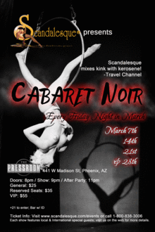 Every Friday Night in March don't miss "Cabaret Noir"! A Dark Cabaret Show featuring the cast of Scandalesque. Whips, Chains, Latex... Oh My! Witness our rendition to high-end S&M. Seductive singers, fierce dancers, adult comedy and wicked specialty acts!