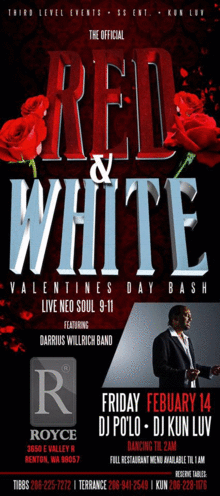 The Official Red and White Valentines Affair Feb 14th 9pm-2am @ The Elegant Royce 3650 East Valley Rd. Renton