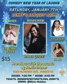 Comedy show with Bay Area comedians. Pre-show with Jamie Ortner, guitarist. In Dennys banquet room. Full menu snd beer and wine available for purchase.