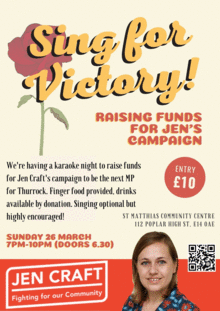 We're having a karaoke night to raise funds for Jen Craft's campaign to be the next MP for Thurrock. Finger food provided, drinks available by donation. Singing optional but highly encouraged! There will also be a raffle and other surprises!