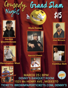 Comedians from all over CA will perform tonight. Nick Foster, multiple comedy competition winner, Cadillac Rob from Tommy Ts comedy, Jordan Quattlebaum, producer and performer at Laughs Unlimited, etc. We are highlighting Christopher West, new comedian tonight. Pre-show music by Jamie Ortner. $15 Doors open at 7:00 PM for ordering food and dinner before show and showtimes 8:00 PM.