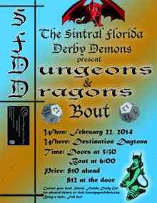 Flat Track roller derby, mixed with Dungeons & Dragons! Roll the die to either help them team of your choosing (Heroes vs Monsters) or screw the other team. There will be skaters from all over the state playing, and things can go crazy on the track with the dice rolls! Costume contests with the best "boutfit" (skaters, refs, NSOs) and best costume in the crowd!