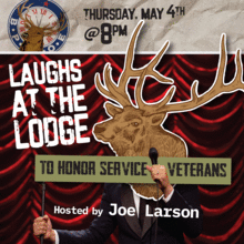 An evening of laughter to benefit Veterans Programs at the Elks Lodge of South Orange. Joe Larson will MC and present 3 professional comics who have appeared at many NYC comedy clubs. (There may even be a special guest.) Money raised will be earmarked to benefit local veterans directly through S.O. Elks. Admission is open to the public (over 21) and lodge members. Guaranteed to make you laugh or your misery back! Doors open 7pm, show starts at 8. The Lodge bar will be serving drinks before, during and after the show (CC's OK).