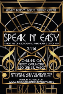 - Sat Mar. 1st 2014 -8pm-2am -18+ with 2 bar's for the 21+ -Fire dancing, juggling and breathing!! -Aeria Silk acts!! -Stilt Walkers!! -Pole Performances!! - Break dancers! -Burlesque acts -Swing Dance -Lindy Hop -Vendor village -Face and Body Painting -Fully decked out venue to set the 1920's theme -Concert style sound and lighting