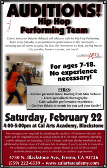 California Arts Academy dance instructor Stefanie Halstead will rehearse with the Hip Hop Performing Team every Saturday in preparation for performances in the community -- including special events at parks, the Zoo, the Downtown Ice Rink, the Big Fresno Fair, parades, farmer's markets, and more!