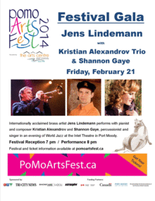 PoMo ArtsFest Gala Reception presents an evening of Jazz, Soul, Latin & Classical Pop. Featuring: Kristian Alexandrov (piano), Shannon Gaye (vocals/percussion), Jens Lindemann (trumpet), Joel Fountain (drums) & Ben Harries (bass). 7pm/Catered reception (event sponsor Christine Catering Company; 8pm/Performance.