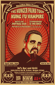 Kung Fu Vampire Headlining The Hunger Pains Tour with Dirtbag Dan and G-Mo Skee live one night only in Keizer, OR! Tickets are $10 in advance and $15 at the door Also Performing Poverty's Posterboy Yung H-D S!lent and Ewok Firing Squad Ent. Justinsayne N8V Belico and So Dope and Eps on the wheels of steel