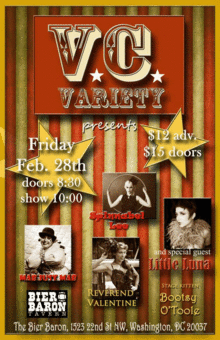 This month's line-up is chock full of fun with DC's own sideshow girl and queen of the uke, Mab Just Mab, the lovably and lovely strange character, Spinnabel Lee, the Sgt. Major of the confusion boner, Reverend Valentine, the cutest kitten around Bootsy O'Toole and finally visiting from NOLA, the adorable Burlesque Barber, Little Luna!