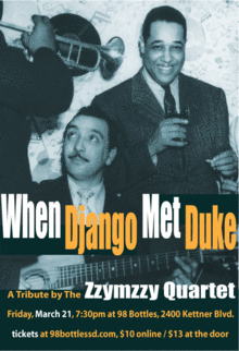 Favorite local swing combo The Zzymzzy Quartet will be celebrating its tenth anniversary with a concert tribute to early jazz greats Django Reinhardt and Duke Ellington. A special set of songs by both composers will evoke the moment in 1946 when the French gypsy guitar virtuoso toured the United States with the legendary bandleader who penned so many jazz classics like "It Don't Mean A Thing If It Ain't Got That Swing".