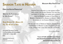 Sharon Tate in Heaven is a one woman odyssey about model and actress Sharon Tate. Sharon did some television work and made six films, her last with Orson Welles, and was on her way to international stardom. She met director Roman Polanski in 1967 when she was hired to play the lead in his film The Fearless Vampire Killers, fell madly in love, and married him. Two years later while pregnant with his child, a boy, she and four others were savagely killed by members of the Charles Manson "family" in August 1969 when Manson, a frustrated musician who wanted to get revenge on the Establishment that rejected him, and with paranoid delusions about a Helter Skelter race war he wanted to start, set it in motion. At the home Sharon and Roman rented on Cielo Drive in Benedict Canyon, Sharon passed before being able to say goodbye to her husband or loved ones. In this one woman show, written and performed by Jen Danby (The Blonde Bombshell Project: Marilyn Monroe), and inspired by research into books, pictures, interviews, films, virtual explorations, and more, Sharon Tate is interviewed in Heaven moments after her death to talk about her life, acting, and love, as a Valentine message to her husband.