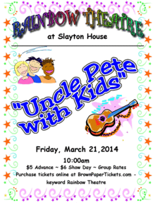 Rainbow Theatre at Slayton House continues this season's series with a special performance by "Uncle Pete with Kids" on Friday, March 21, 2014. Join us for this wonderful children's interactive musical celebration. This is a unique and energetic musical performance for the enjoyment of children and their families. Show time is 10:00am in the Slayton House Theatre in the Village of Wilde Lake, Columbia. Tickets should be purchased in advance for $5 each and may be available at the door for $6 each; exact cash or check only, no reservations, no refunds. Group rates. For information call 410-730-3987. Sponsored by Wilde Lake Community Association. Email events@wildelake.org or go to our website "wildelake.org" for a copy of this season's brochure. Tickets may be purchased online at BrownPaperTickets.com. keyword: Rainbow Theatre.