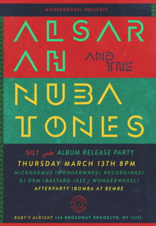 Wonderwheel Recordings is pleased to invite you to Alsarah & the Nubatones' debut album release party in nyc. The album titled "Silt" or "طمي" in arabic features a collage of traditional and original material springing out of the nubian and north sudanese sounds. It features Alsarah on Vocals, Rami Elasser on percussion, Haig Manoukian on Oud, and Mawuena Kodjovi on Bass.
