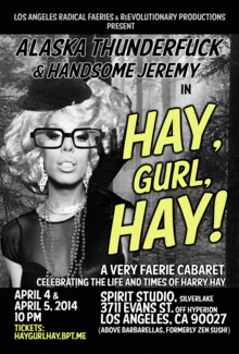 Just in time for Hay Days, 2014, join glamazonian chanteuse and starlet of stage and screen Alaska Thunderfuck, along with her scholarly musical companion, pal, and confidant, Handsome Jeremy for "Hay, Gurl, Hay!"-- a very faerie cabaret celebrating the life and times of Harry Hay, presented by the Los Angeles Radical Faeries and ReEvolutionary Productions. Bejewel and bedazzle your queer body at the glittering station, and then enjoy a night of frivolous original music and re-imagined standards that will take you on a journey honoring the life and the legacy of Ms. Hay herself.