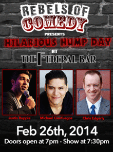 Rebels of Comedy presents Hilarious Hump Days at the Federal Bar in North Hollywood. Come out and see a night of live comedy, featuring an awesome lineup of professional features and headliner comedians.