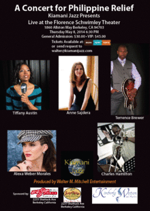 A evening with: Terrence Brewer - Anne Sajdera - Charles Hamilton - Tiffany Austin - Alexa Weber Morales. proceeds from ticket sales will go to support citizen of the disaster area of the Philippine's caused by, Typhoon Haiyan; ShelterBox & The Philippine Red Cross are the charities to benefit from this Concert. Produced By: Walter M. Mitchell Entertainment