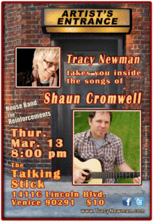 This is the second episode of my new interview series, Artist's Entrance. My good friend, singer/songwriter/musician extraordinaire, Shaun Cromwell, will be joining me at The Talking Stick in Venice on Thursday, March 13th, 8PM, to play some of his songs and give us the stories behind them. I might even ask him to define some of the words he so casually uses, like culvert, camber and samp. I know - I can look them up, but I want to see Shaun squirm. Here is what one audience member said to me after seeing Shaun play: "When that guy (pointing at Shaun) started playing, something happened to my heart." If you want something to happen to your heart, or your "chest pump," as Shaun calls it, don't miss this night! My wonderful band, the Reinforcements (Gene Lippmann, Paula Fong, John Cartwright and Doug Knoll,) will also be on hand. I hope you'll join us for an especially enlightening and fun evening. Tickets are $10. Pay here, or at the door. The Talking Stick has recently been remodeled, and features a new vegan menu along with a well-stocked soup/salad bar. No alcohol. Ample free parking.