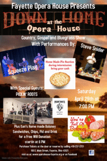 Join us for Down Home at the Opera House and Full of Boloney night for a fun filled evening beginning at 6:00 PM with Ken Thatcher's homemade fried boloney sandwiches, chips, cold drink and pie for a free will donation.