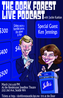 This edition features special guest Ken Jennings! Kenneth Wayne "Ken" Jennings III (born May 23, 1974) is an American game show contestant and author. Jennings is noted for holding the record for the longest winning streak on the U.S. syndicated game show Jeopardy! and as being the all-time leading money winner on American game shows. In 2004, Jennings won 74 Jeopardy! games (in a row) before he was defeated by challenger Nancy Zerg on his 75th appearance. His total earnings on Jeopardy! are $3,172,700, consisting of $2,520,700 over his 74 wins, a $2,000 second-place prize in his 75th appearance, a $500,000 second-place prize in the Jeopardy! Ultimate Tournament of Champions, as well as half of a $300,000 prize in the IBM Challenge, when he competed against Watson. During his first run of Jeopardy! appearances, Jennings earned the record for the highest American game show winnings. His total was surpassed by Brad Rutter, who defeated Jennings in the finals of the Jeopardy! Ultimate Tournament of Champions (first aired on May 25, 2005), adding $2,000,000 to Rutter's existing Jeopardy! winnings. Jennings regained the record after appearing on several other game shows, culminating in an appearance on Are You Smarter Than a 5th Grader? (first aired on October 10, 2008), though Rutter retains the Jeopardy! record.