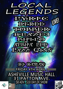 Genre: Hip Hop / multi-genre Cover: $8adv. / $10d.o.s. Ages: 21+ Event Listing: http://ashevillemusichall.com/music-schedule/avlpromo-presents-local-legends/